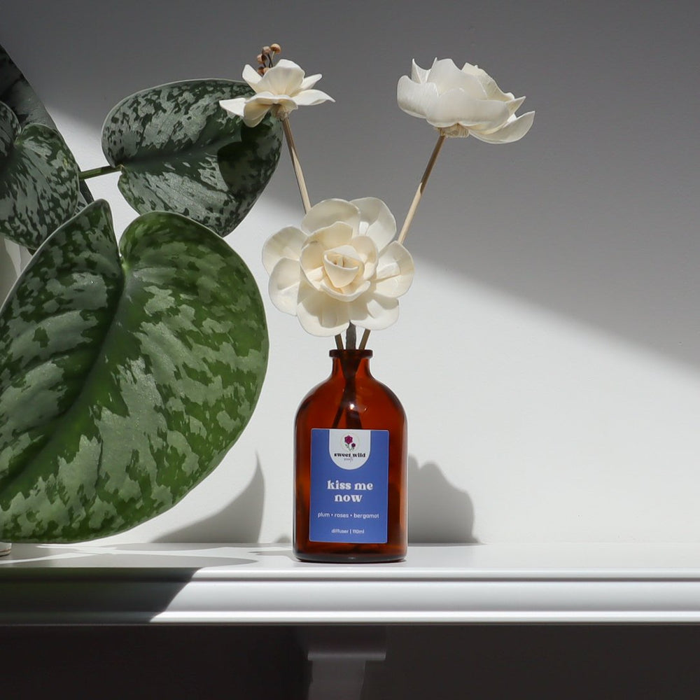 Flirt with fragrance using our Sola Wood Flower Diffuser in Kiss Me Now. Sweet; romantic; and playfully bold; this scent blends juicy fruits with soft vanilla and musk.