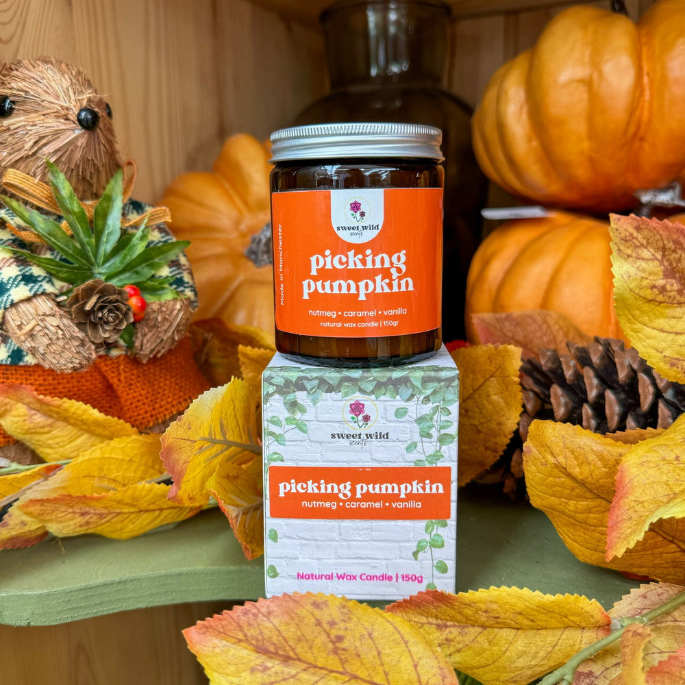 Poured into a 150g amber glass jar with a cotton wick, Picking Pumpkin is ideal for autumn lovers, seasonal decorating, or gifting that first breath-of-fall feeling.